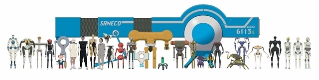 さらに特別に公開されたのは、本作に登場する様々なロボットたちが横並びで一列に配置された大集合写真。アリーヌ以外は全てロボットで、体格差やデザイン、装備の違いを見比べることができる。それぞれの特徴をじっくり堪能しながら楽しんで観察してください。