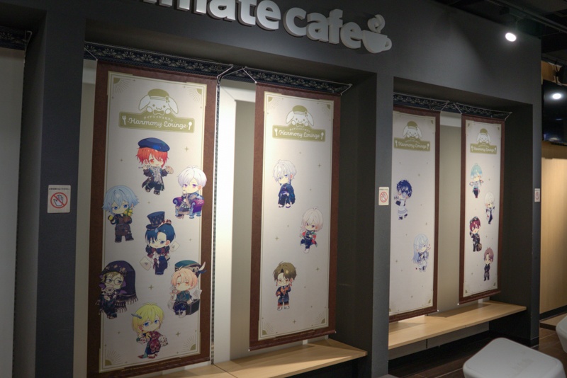 店内には今回のテーマ「Group Anniversary 2024」の新規ビジュアルのアイドルたちが描かれたタペストリーが展示され、華やかながらも落ち着いた雰囲気の空間が広がっています。