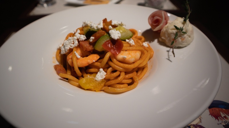 そんな「Binary Vampire」をイメージしたフードはナポリタン。もっちりとした太麺のパスタに、生ハムの薔薇とポテトサラダが添えられており、吸血鬼が城で嗜む上品な一皿のよう。