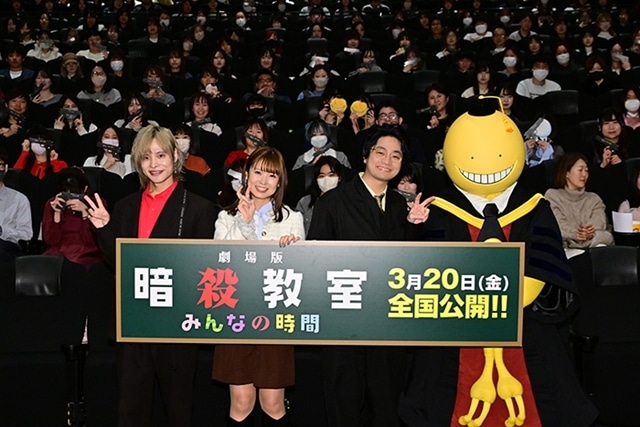 2月22日(日)には生朗読劇付き<完成披露試写会>を実施! メインキャストの福山潤さん・渕上舞さん・岡本信彦さん・殺せんせー(着ぐるみ)が登壇しました。