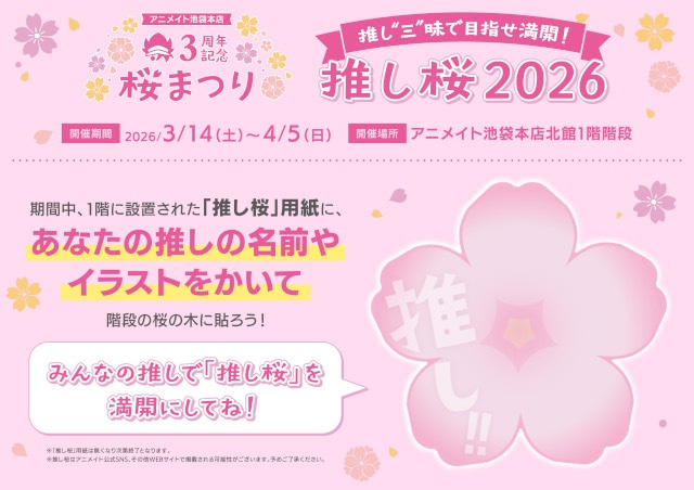 そんなアニメイト池袋本店のリニューアル3周年を記念した本施策では、昨年大好評をいただいた「推し桜」や、30,000円分のアニメイト商品券やゲームソフトなど3周年仕様の豪華景品が抽選で当たる「桜まつり抽選会」、桜まつり開催記念限定商品の販売などを実施!