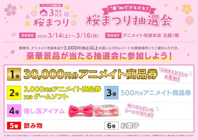 アニメイト池袋本店3周年を記念して、桜まつり抽選会を開催! 3周年を記念した豪華景品をラインナップ。なんと1等は、30,000円分のアニメイト商品券…!?