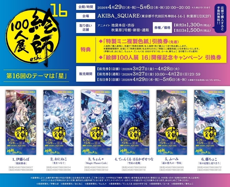 【絵師100人展 16】2026年4月29日(水・祝)よりAKIBA_SQUAREで開催! 3月27日(金)よりアニメイトで前売入場券が販売開始!