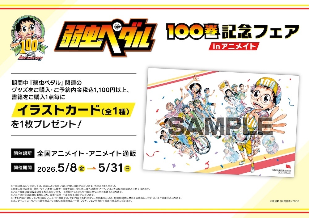 期間中『弱虫ペダル』関連のグッズをご購入・ご予約内金1,100円(税込)以上、書籍をご購入1点毎にイラストカード(全1種)を1枚プレゼント!
