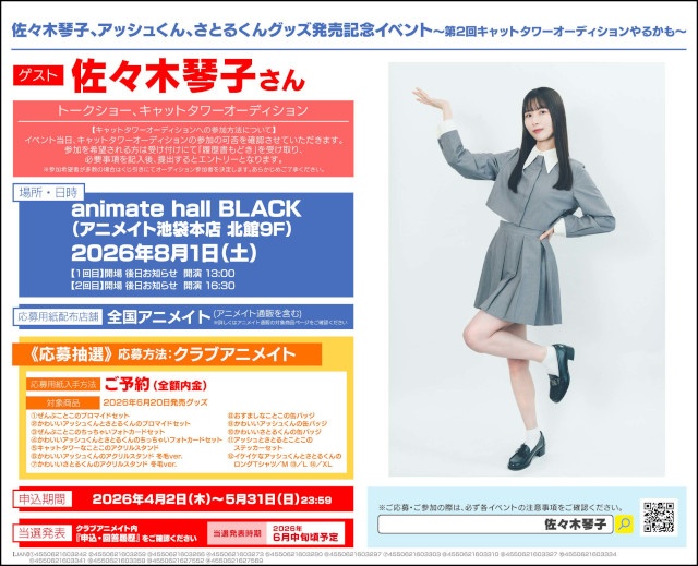[応募シリアル入手方法]全国アニメイト・アニメイト通販にて2026年6月20日(土)発売の「佐々木琴子さん」グッズをご予約内金(通販は注文時の決済)3,000円(税込)毎に、イベント応募シリアルを1つプレゼントいたします。