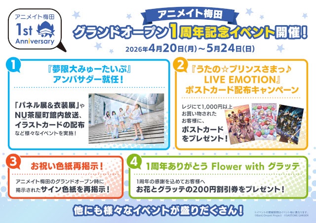 他にも、グランドオープン時に著名人の皆さまよりいただいたサイン色紙の再掲示や「1周年ありがとうFlower with グラッテ」、「『うたの☆プリンスさまっ♪ LIVE EMOTION』ポストカード配布キャンペーン」などの施策を実施いたします。