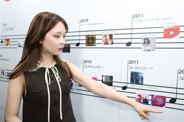 【主題歌エリア】では、「私がちょうどコナンを熱心に見ていた時期は、倉木麻衣さんの楽曲が主題歌だったと思います。『Secret of my heart』とか『恋に恋して』とか…」と語りながら歴代のオープニング曲やエンディング曲の展示を見学し、『恋に恋して』のジャケットを見つけると「あ、これだ!この曲はすごい印象に残ってて、今でも歌えるぐらいよく聴いてました!」と、当時の思い出を明かしました。