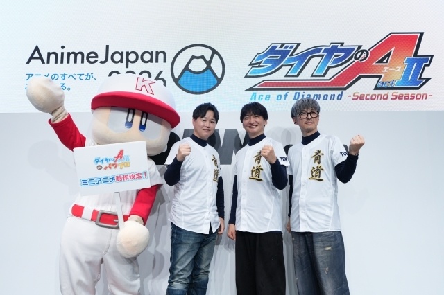 2026年4月5日よりテレ東系6局ネット、AT-Xほかにて放送開始予定の「TVアニメ『ダイヤのA actⅡ -Second Season-』」。DMM.com/DMM TVブースステージには沢村栄純(さわむら えいじゅん)役・逢坂良太、降谷 暁(ふるや さとる)役・島﨑信長、御幸一也(みゆき かずや)役・櫻井孝宏が登壇。「青道高校 野球部」のユニフォームに身を包み、作品に関するトークを繰り広げた。