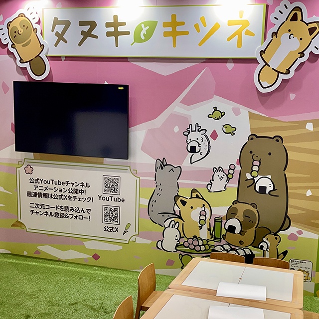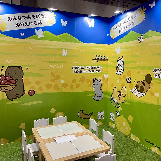 『タヌキとキツネ』の世界観を彩るステキなアイテムを塗って、切って、貼れる「ぬりえコーナー」や一緒に写真が撮れる「顔出しパネル」を設置。