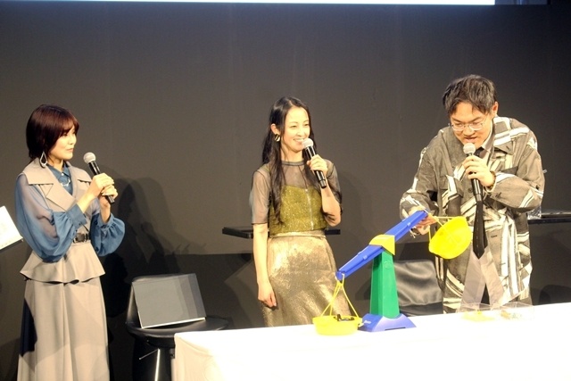 そして、今回の特別企画「最強の鑑定力を持つのは誰だ!? 重さ鑑定クイズ」も行われることに。ステージには軽量用の天秤が運ばれ、用意したアイテムの重さと同じ重さになるようにプラスチックのコインとビー玉を置いて、二つが釣り合えば成功というもの。