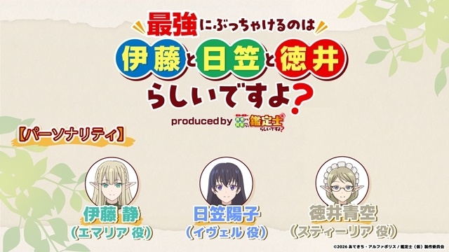 WEBラジオ「最強にぶっちゃけるのは伊藤と日笠と徳井らしいですよ?」produced by 鑑定士(仮)が、4/10(金)18:00〜 アニメ公式YouTube&公式X、dアニメストア、音泉にて配信開始!