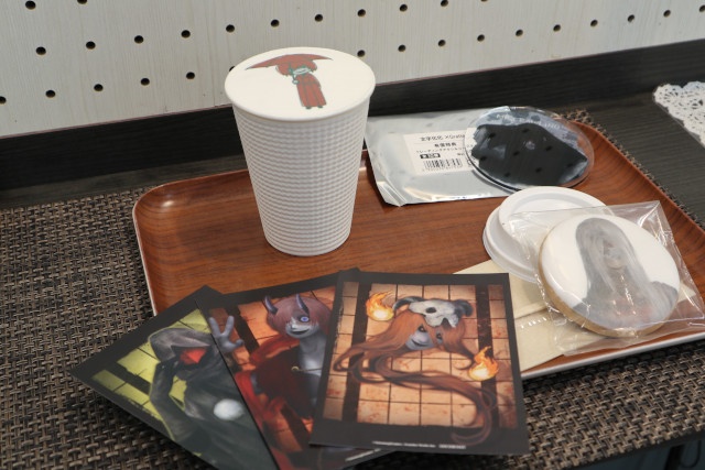 期間中『文字化化』関連のグッズ・ゲームをご購入1,100円(税込)毎にフェア特典「イラストカード(全8種)」を1枚、グラッテ飲食・有償特典をご購入・ご予約(内金全額必須)1点毎にフェア特典「イラストカード(全8種)」を1枚プレゼント! 同イラストを使用したフェア特典はここでしか手に入らないので、是非この機会をお見逃しなく。
