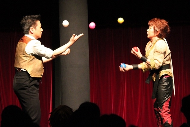 その田中真弓さんとは歌謡ショウをきっかけにジャグリングを練習する仲になり、今もジャグリングは続けている。画像は2018年2月3日開催「サクラ大戦歌謡ショウより~『続・花咲く男たち』大帝国劇場支店花やしき支部劇場」から大神とカンナのジャグリング