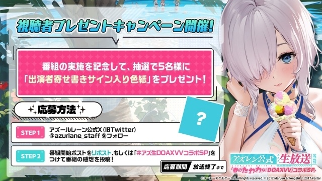 生放送の実施を記念して、「4月のアズレン公式生放送-春のたわわな『DOAXVV』コラボ SP-」の番組開始と同時に、抽選で5名様に「出演者サイン色紙」が当たる SNSキャンペーンを開催予定となります。