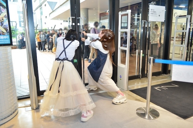 開店時間が迫るなか、仲町さんと峰月さんが、入り口前でお並びいただいているお客様を発見。するとまだ施錠されたドアへ向かって御覧のパフォーマンス!!
